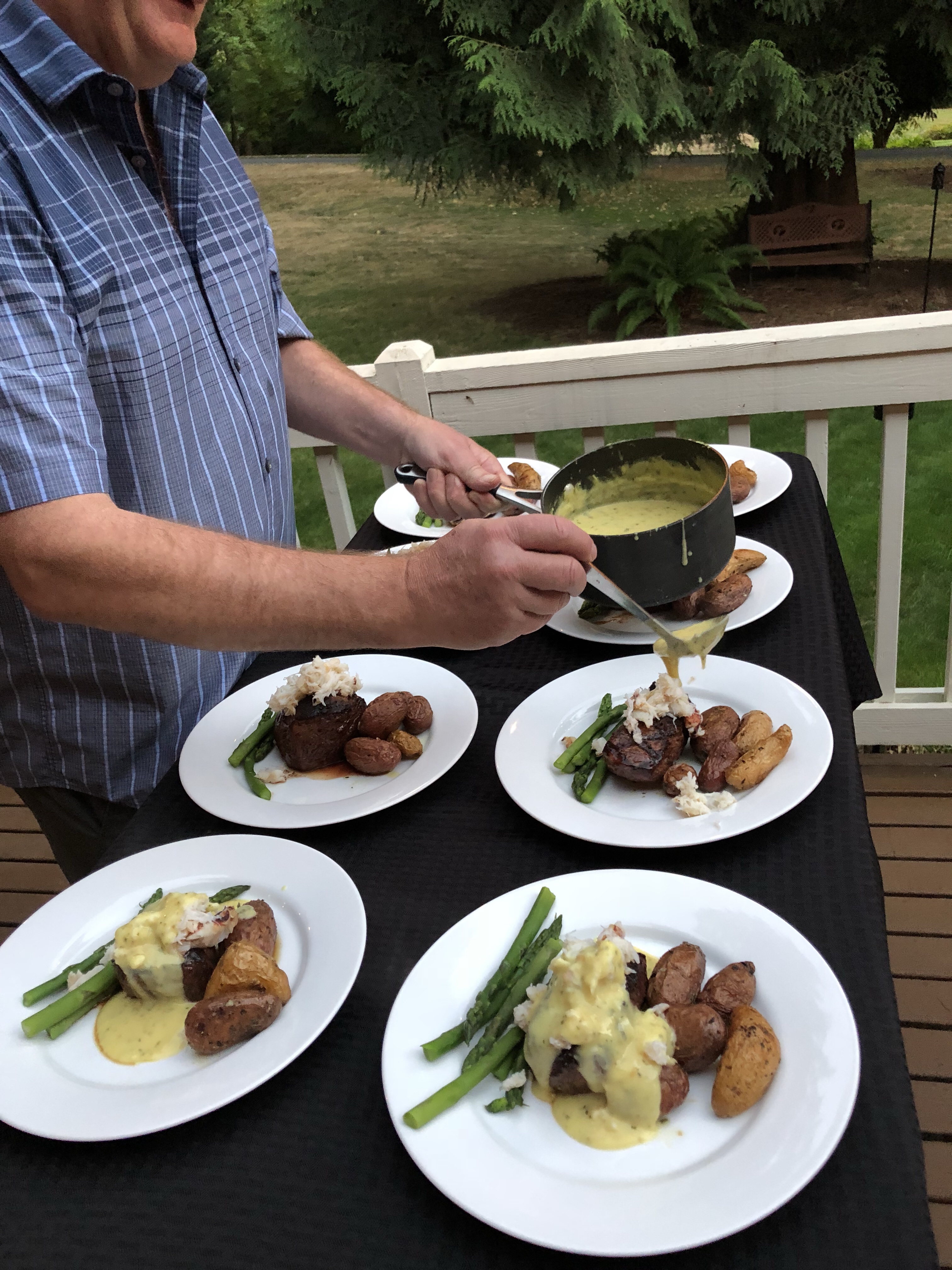 – Steak Oscar with Dungeness crab, asparagus, bernaise sauce and herb roasted potatoes