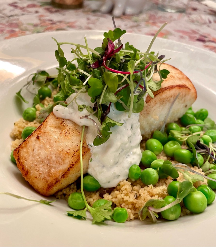 Saturday night dinner at home with Chef fixing Halibut with fennel and line crema, mushroom couscous and fresh english peas