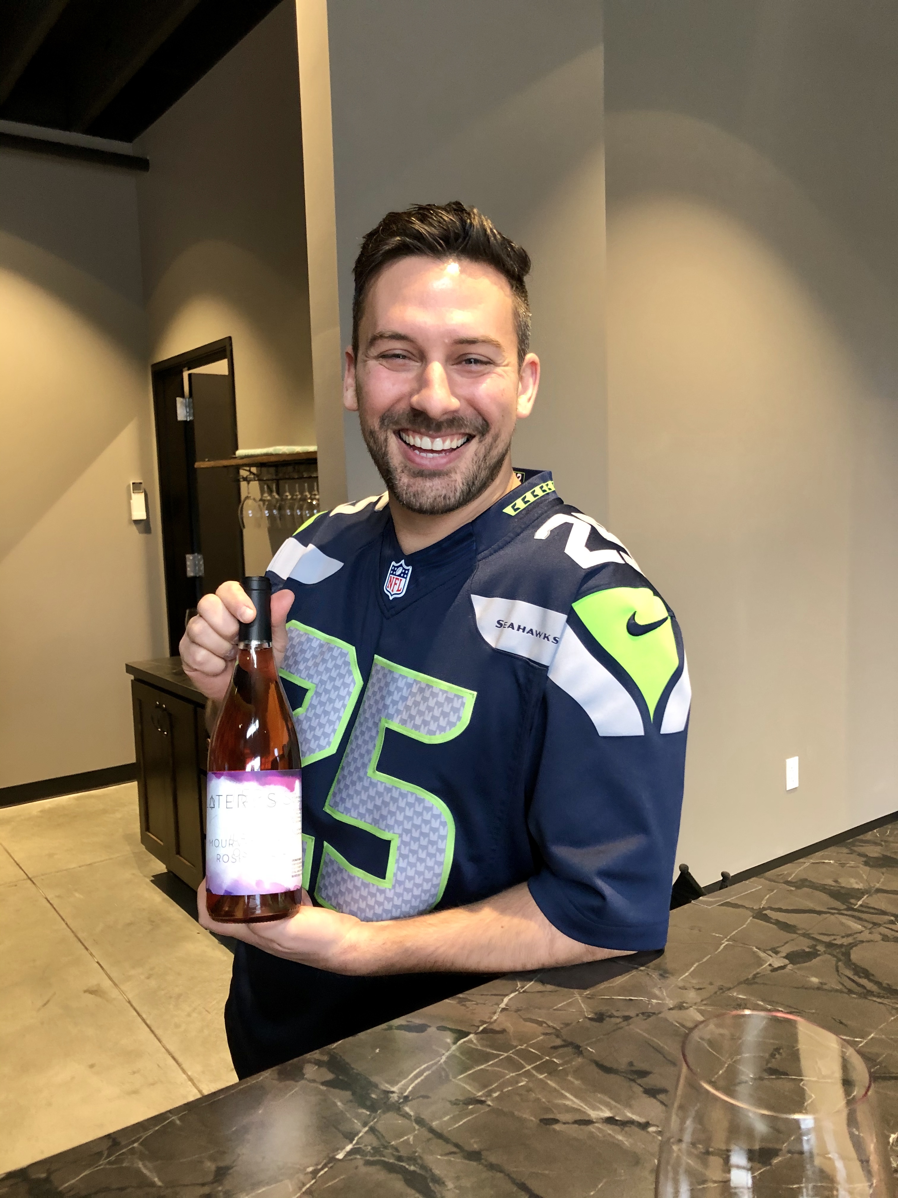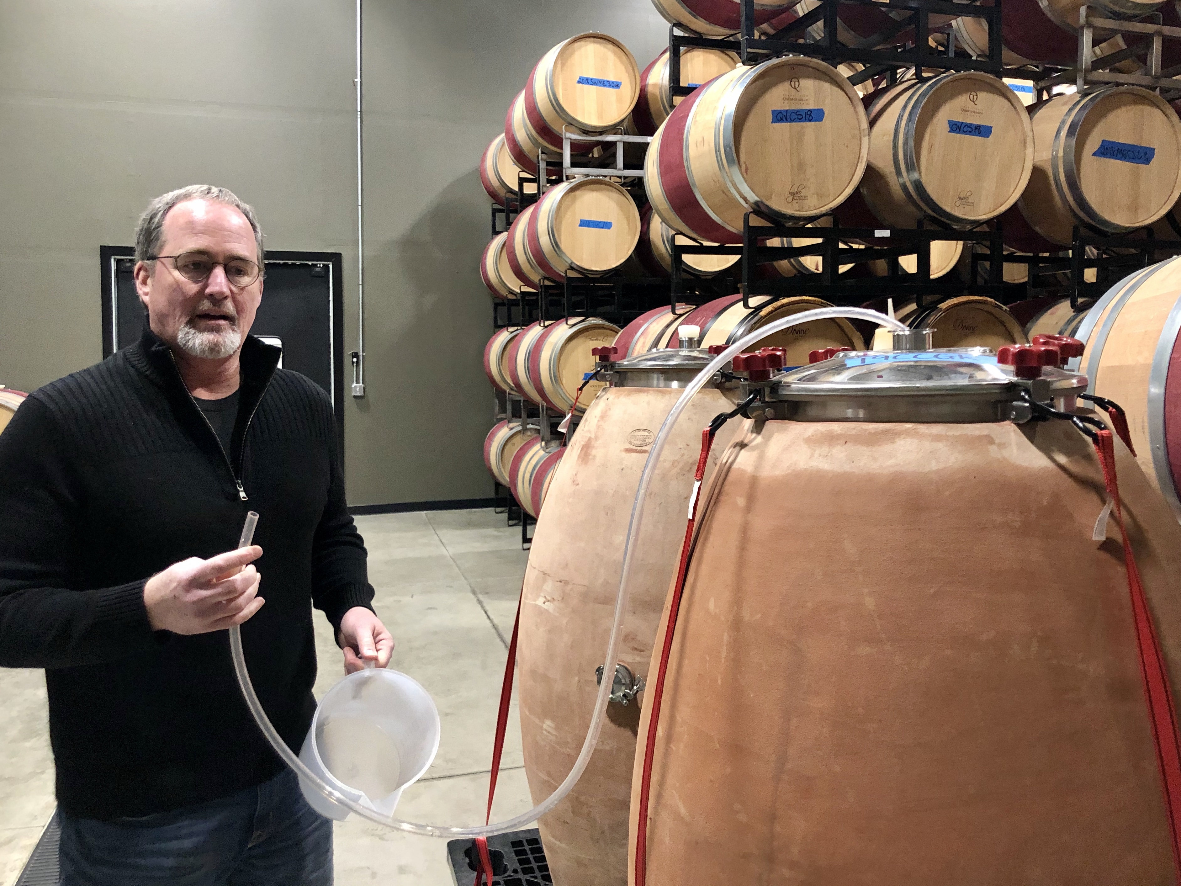 JM Cellars: Launched in 1998, the winery is headquartered at Bramble Bump, a 7-acre property in Woodinville. Owner John Bigelow worked in Walla Walla vineyards with such acclaimed winemakers as Charlie Hoppes, Mike Januik and Holly Turner before purchasing his own — Margaret’s Vineyard — in 2006. JM Cellars’ tasting room in Maltby focuses on the winery’s trademark burgundy-striped barrels. Pictures below: Winemaker John Bigelow showing Kevin and I the new production space and tasting out of a clay vessel.