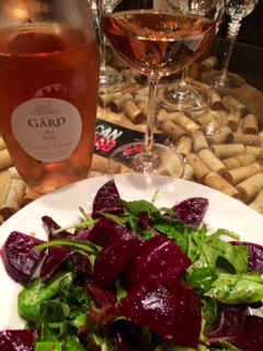 Kevin whipped up course number two: a tomato micro green salad with apple balsamic vinaigrette with a Scarborough Rose’ of Grenache. I love balsamic vinegar and the micro greens were fantastic with the tomatoes adding a bit of spicy flavors. This was a Rose’ we had not tried before. It was a nice, dry Rose’ which paired really well with Kevin’s dish.